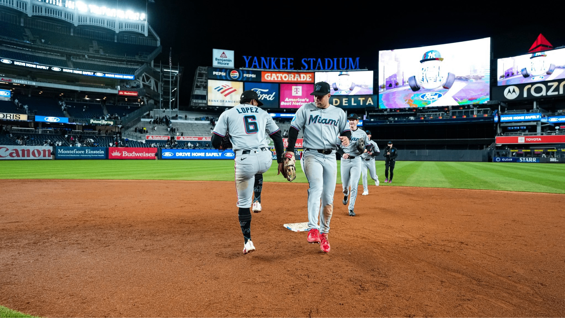 En la octava entrada, con un out, el relevista de los Yankees Fernando Cruz otorgó base por bolas a Marsee, y el mánager Aaron Boone trajo al derecho Jake Bird para enfrentar a Otto Lopez. Bird dio base por bolas a López y golpeó a Griffin Conine, quien bateaba como emergente.
